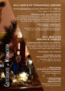 - Gottesdienste an Weihnachten 2022 Heilig Abend in der Thomaskirche Großreuth Heilig Abend in der Stephanuskirche Gebersdorf 1. Weihnachtstag 10:15 Uhr in der ThomaskircheGemeinsamer Gottesdienst mit dem Posaunenchor 2. Weihnachtstag 10:15 Uhr in der StephanuskircheGemeinsamer… Heilig Abend in der Thomaskirche Großreuth Heilig Abend in der Stephanuskirche Gebersdorf 1. Weihnachtstag 10:15 Uhr in der ThomaskircheGemeinsamer Gottesdienst mit dem Posaunenchor 2. Weihnachtstag 10:15 Uhr in der StephanuskircheGemeinsamer…